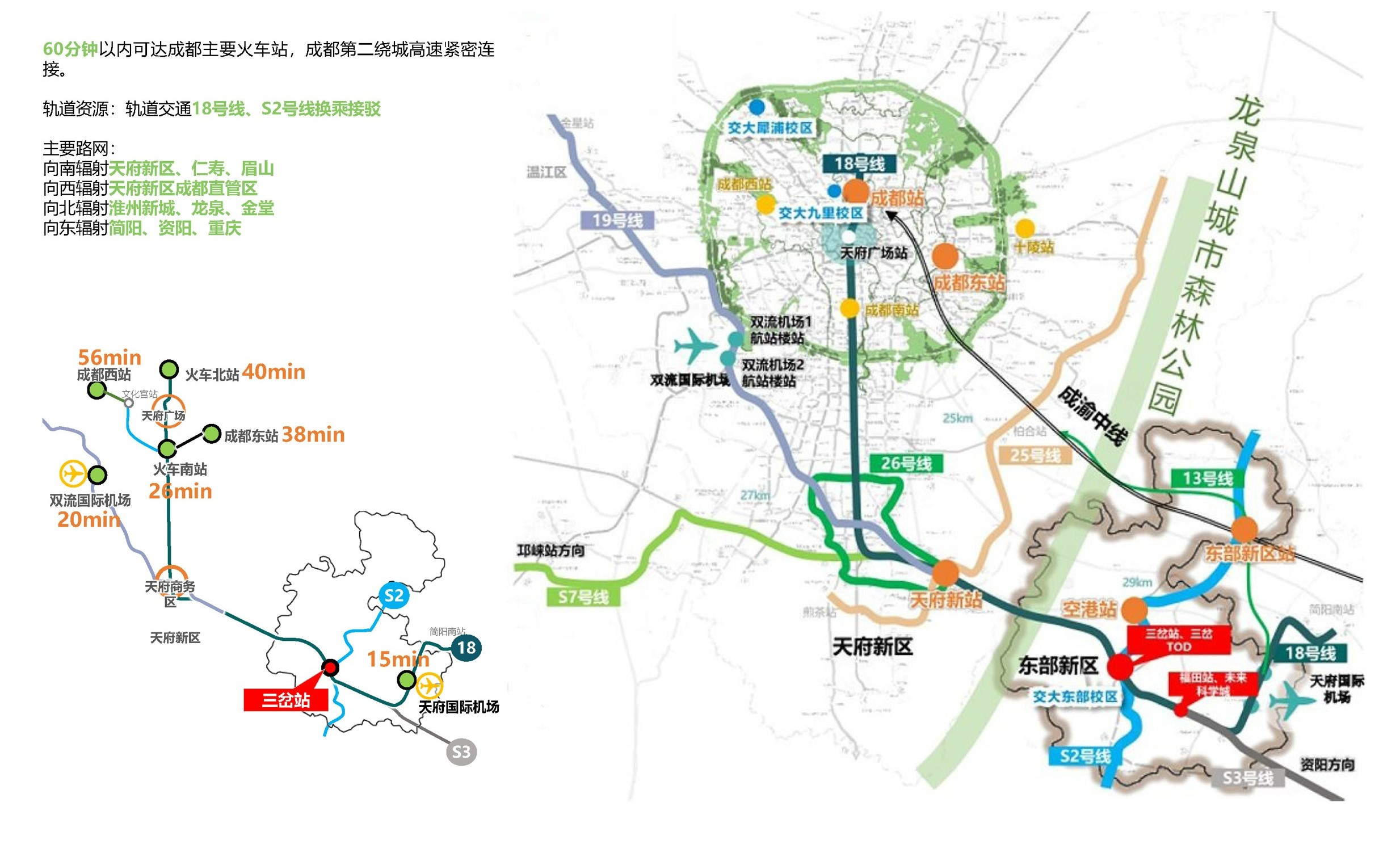 av影片 成都东部(国际)校区开创TOD+学研+城市的城市高校建设新范本,通过地面慢行系统和空中连廊慢行系统,与三岔地铁站无缝连接,可以充分享受地铁等舒适快捷的公共交通。av影片 成都东部(国际)校区在地铁18号线三岔站五到十分钟步行圈内,15分钟到达天府国际机场,30分钟到达成都南站,60分钟内到达成都主要的机场和火车站。