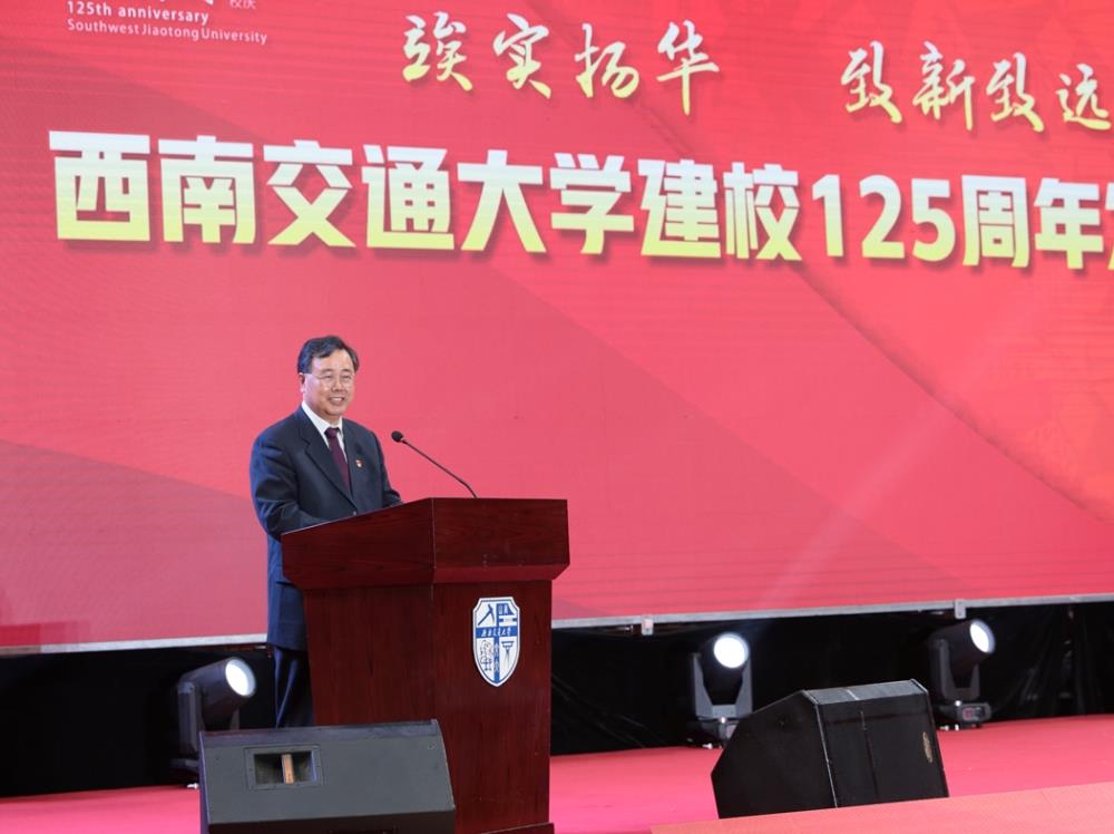 杨丹作“竢实扬华,致新致远”主题报告。他回顾了学校125年的奋斗历程:125年来,西南交大秉持家国情怀,兴学强国、筑路报国;125年来,西南交大坚守初心使命,润心启智,桃秾李郁;125年来,西南交大塑造大学精神,竢实扬华,自强不息;125年来,西南交大推动教育开放,贯通中外,交通成和。他表示,125年来,学校牢牢扎根中国大地,书写了无愧于历史、无愧于时代的光彩答卷。学校由衷地向各级领导、社会贤达长期以来对学校的亲切关怀和鼎力支持表示感谢;并向为创业立校付出毕生努力与辛勤汗水的交大先贤、历届领导班子和全体老领导、老同志,向奋进与坚守的全校教职员工,向爱校如家、饮水思源的万千海内外校友校亲们,致以崇高的敬意!