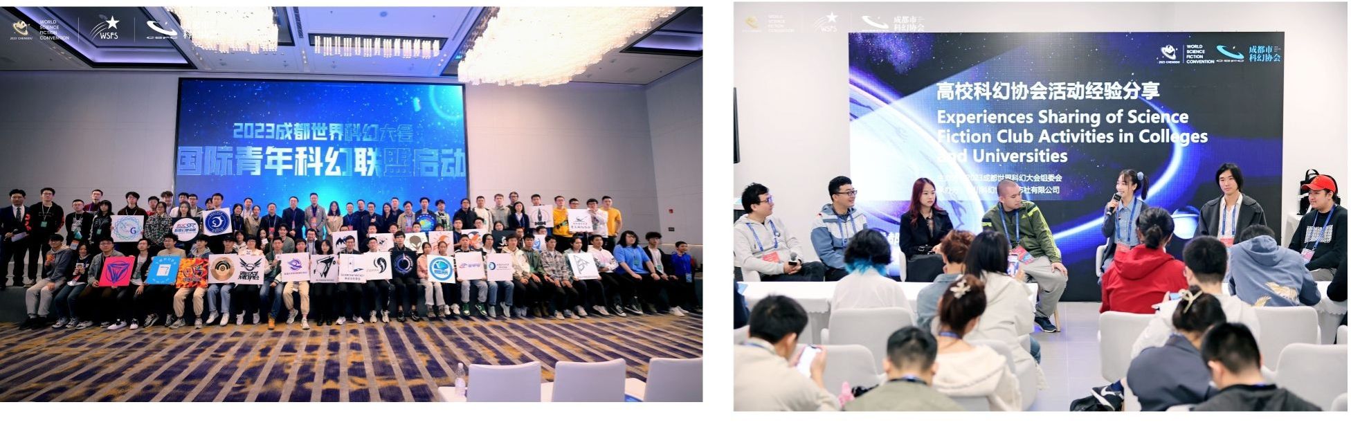 科幻协会作为团体嘉宾深度参与其中。协会指导老师敬春元受邀参加国际青年科幻联盟成立及倡议大会,协会成员受邀参加高校科幻协会活动经验分享会,共同推进中国科幻事业和科幻产业的发展和创新;协会全程在大会场馆一楼幻迷展厅设置展位,宣传展示协会发展成果,向国内外嘉宾、会员等参观者分发和交换协会自制“会刊”、协会徽章等文创周边物料,并联合清华大学科幻协会、四川大学科幻协会、电子科技大学科幻协会三所友校幻协共同组织集章活动;同时协会还在成都科幻馆水星厅承办主题沙龙,组织来宾一起参与口头科幻故事创作,共同放飞想象。