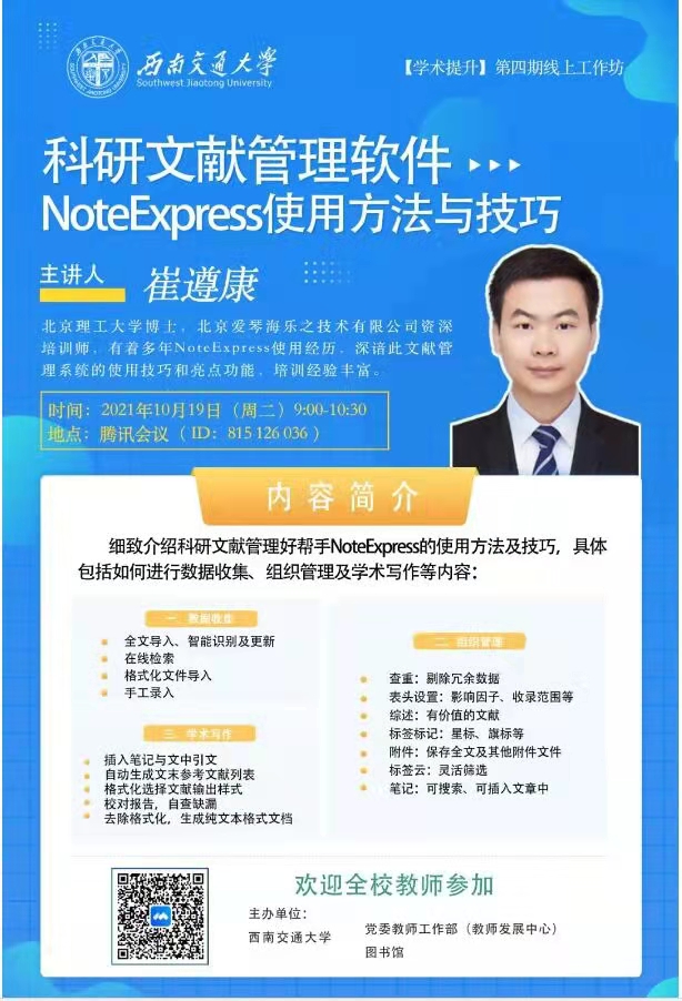 内容简介:细致介绍科研文献管理好帮手NoteExpress的使用方法与技巧,具体包括如何进行数据收集、组织管理及学术写作等内容: