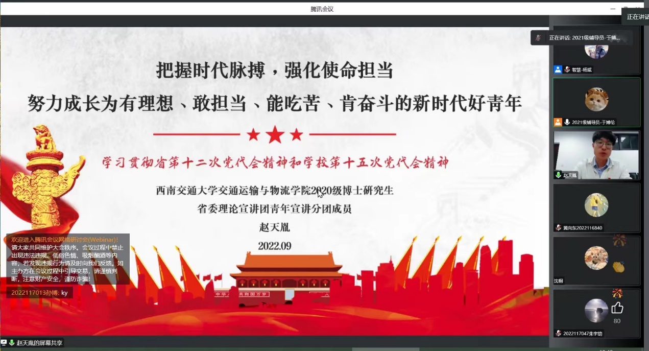 9月23日,学院党委举行四川省第十二次党代会精神和学校第十五次党代会精神专题学习会,四川省委理论宣讲团青年宣讲分团成员、学校青年讲师团成员、交通运输与物流学院2020级博士研究生赵天胤受邀进行理论宣讲。学院全体教师党员、入党积极分子、团干部以及广大学子参加学习。学习会由学院团委书记于博伦主持。