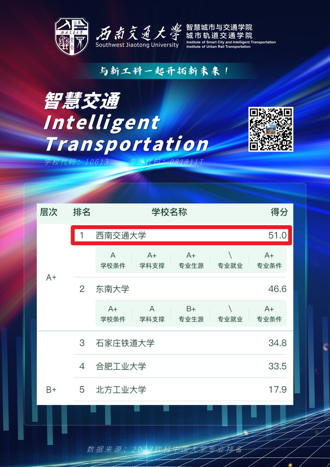 智能建造、智能制造工程位列A层次,排名全国第5、第10。新能源科学与工程、城市设计位列B+层次,排名全国第20、第3。智慧交通位列A+层次、排名全国第1。五个新工科专业全部上榜,彰显了学校和学院在人才培养方面的专业实力。