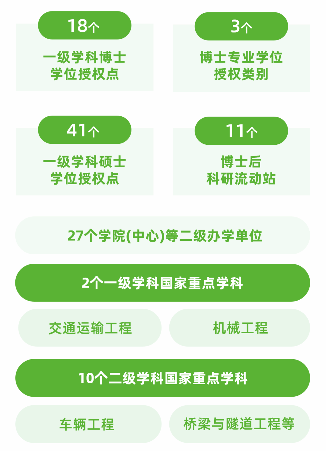 交通运输工程学科位居全国第一(A+)并进入国家“双一流”建设序列,土木工程学科位居全国A序列,土木工程、机械工程、电气工程进入世界前50强(软科世界一流学科排名和US NEWS学科排名)。工程学、计算机科学、材料科学、化学、社会科学、地球科学、环境/生态学、物理学、经济学与商学等学科进入ESI世界排名前1%,工程学进入ESI世界排名前1‰。
