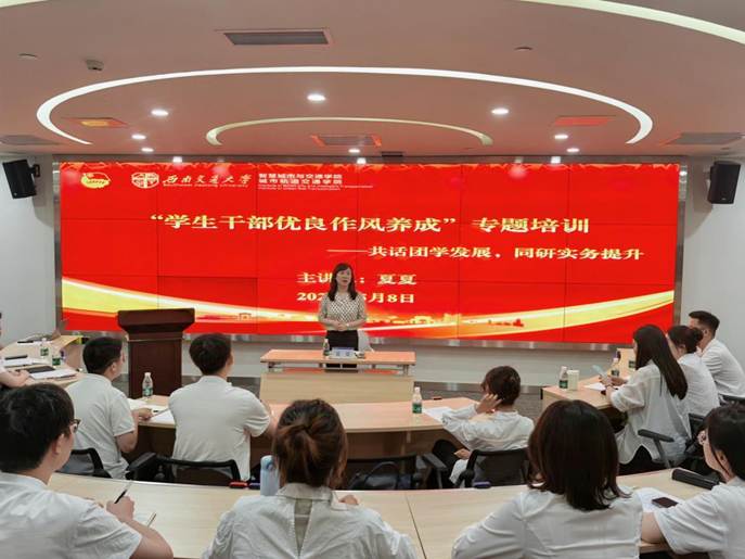 开班式结束后,学院党委副书记夏夏以《学生干部优良作风养成》为题带来开班第一课。她勉励学员们要做有品德、有责任心、有行动力、有想法的学生干部,改进工作作风,力戒形式主义、官僚主义、利己主义等不良风气,努力成为“政治坚定、德才兼备、素质全面、模范表率、堪当重任”的青年学生骨干。