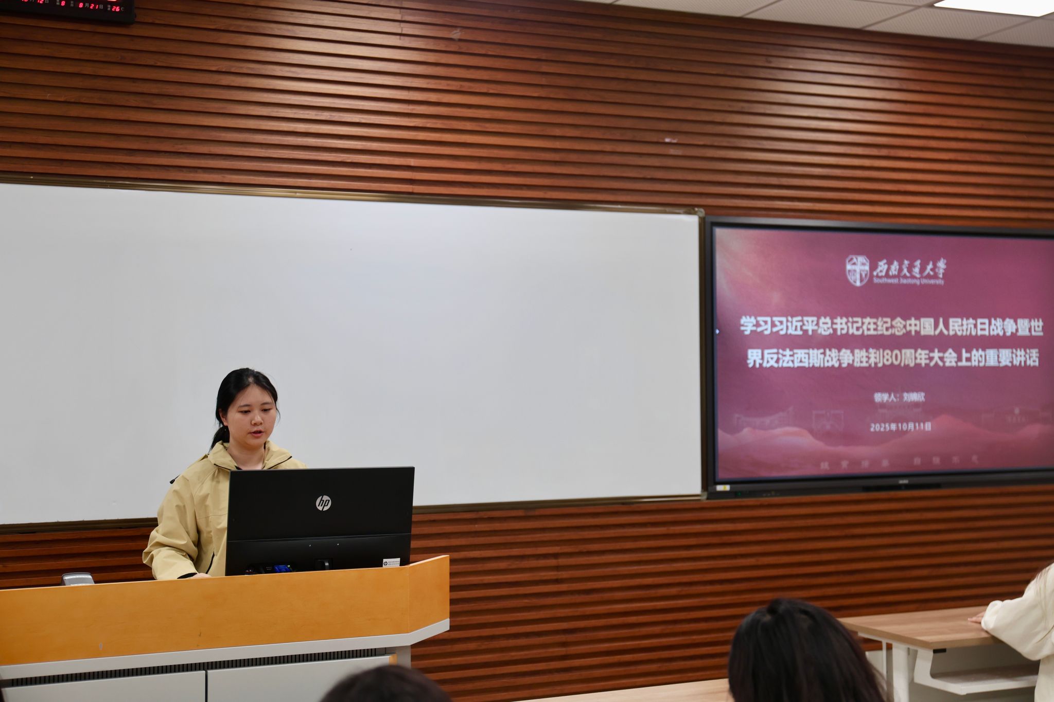 学生会于2025年10月12日下午在X1201开展主题为“学习习近平总书记在纪念中国人民抗日战争暨世界反法西斯战争胜利80周年大会上的重要讲话”的政治学习暨全员大会。本次学习由智慧城市与交通学生会主席团候选人刘锦欣领学,指导老师魏岚与学生会全体成员参加。