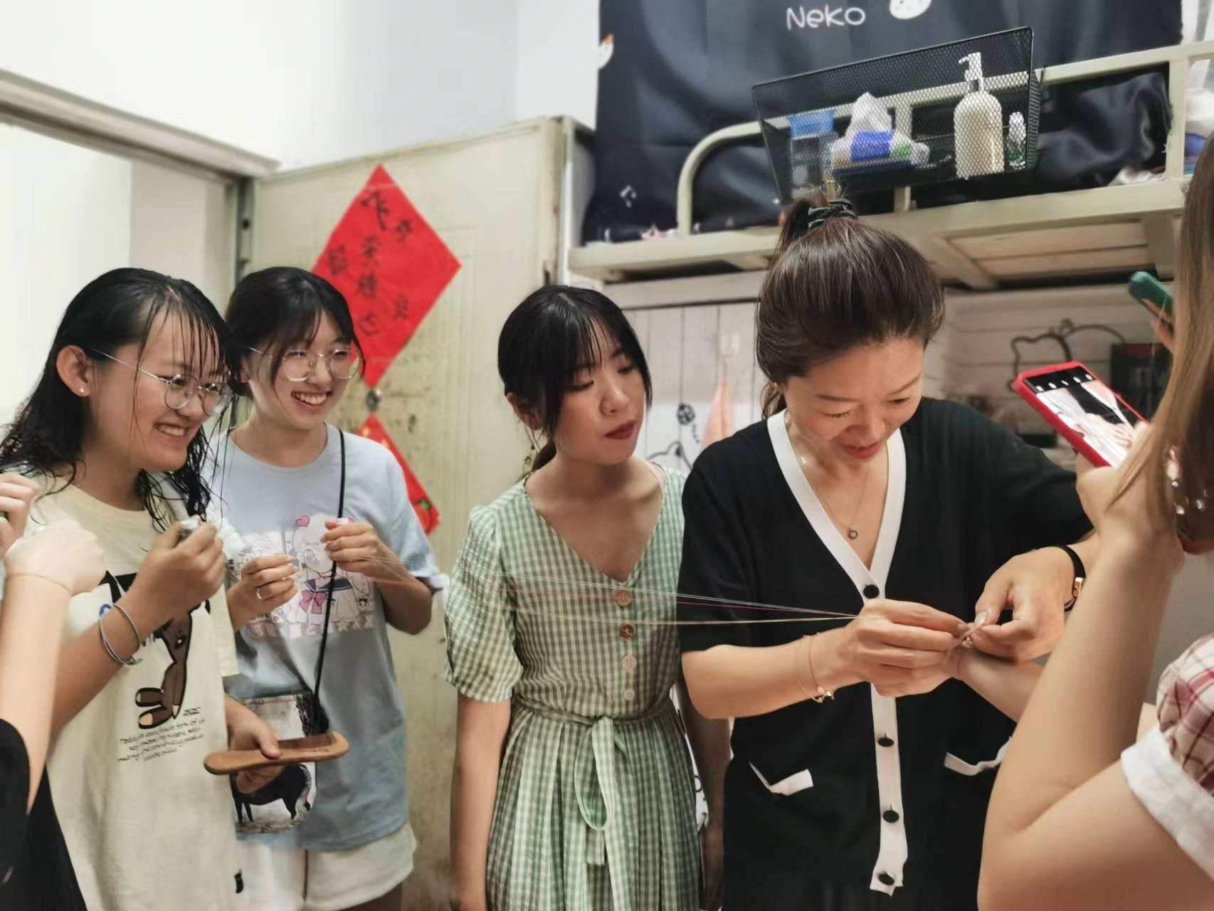 编彩绳,纳福瑞。罗妍妍走近学生宿舍为大家编织五彩绳,同时为大家讲解了五彩绳的来历和寓意。同学们也都被这一传统习俗所吸引,争相学习编织五彩丝,也为老师们献上节日祝福。