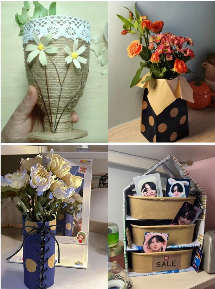 在收纳之余,为帮助学生提升节能环保的意识,形成良好的资源循环利用习惯,本次活动还鼓励参赛者对宿舍废旧物进行改造。参赛者利用宿舍的废弃包装、纸张、衣物等,设计独具匠心的作品,体验环保乐趣的同时,也能够提高参赛者对宿舍废旧物的利用能力。
