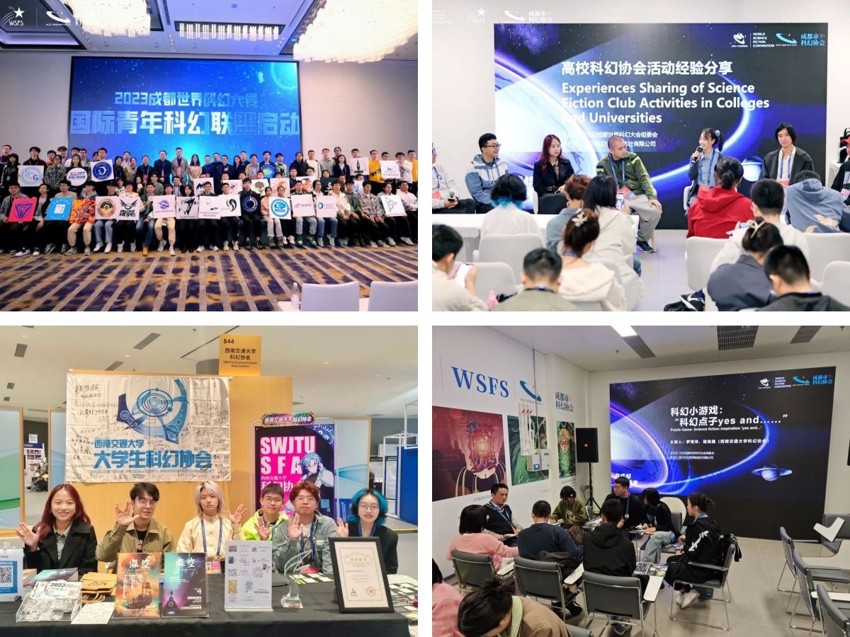 科幻协会作为团体嘉宾深度参与其中。协会指导老师敬春元受邀参加国际青年科幻联盟成立及倡议大会,协会成员受邀参加高校科幻协会活动经验分享会,共同推进中国科幻事业和科幻产业的发展和创新;协会全程在大会场馆一楼幻迷展厅设置展位,宣传展示协会发展成果,向国内外嘉宾、会员等参观者分发和交换协会自制“会刊”、协会徽章等文创周边物料,并联合清华大学科幻协会、四川大学科幻协会、电子科技大学科幻协会三所友校幻协共同组织集章活动;同时协会还在成都科幻馆水星厅承办主题沙龙,组织来宾一起参与口头科幻故事创作,共同放飞想象。