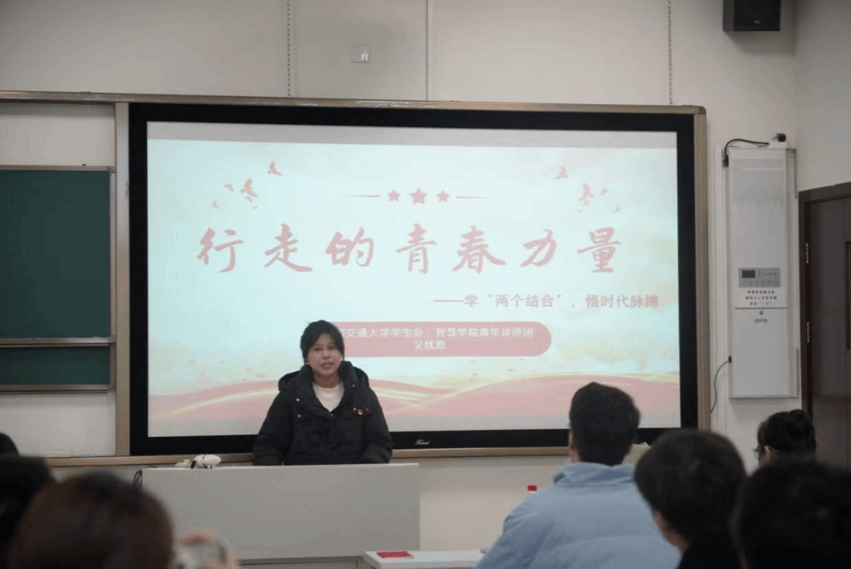 学院青年讲师团成员、校学生会副主席吴忧悠面向团员和青年开展理论宣讲,从她重温习近平总书记考察足迹的社会实践活动经历出发,并带领青年们深入学习“两个结合”重要思想,号召大家在“行走的思政课堂”中真学、真听、真看、真感悟,以实际行动在强国建设、民族复兴的历史进程中挺膺担当。