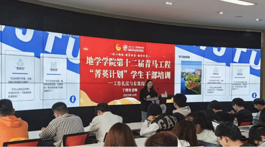于博伦受邀参与地学学院第12届青马工程“菁英计划”学生干部培训,主讲“工作礼仪和有效沟通”主题。于博伦从“何为学生干部”的问题切入,讲述了学生干部应当起模范带头作用,做老师和同学之间的桥梁纽带。具体从礼貌称呼、时间意识和时间管理、工作反馈、形象管理四个方面分类别教育我们作为学生干部应有的职业素养。学生干部应明确清晰表达四原则,训练结构化思维,学习如何倾听。从礼仪和效率两方面高度总结并教育学生干部在今后的任职道路上应以身作则、勤于奉献、待人有礼、高效作业。
