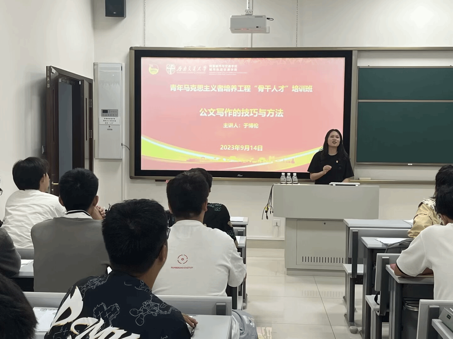 于博伦受邀参与学院首届“青马工程”骨干人才班培训,主要针对公文写作的技巧与方法开展培训,她以活动策划为引,为学员们从公文的属性开始,讲述公文写作的要领、方法。通过讲解范例,让学员更深入地了解公文写作的规范与要求,并鼓励学员们在以后的学生工作中,像公文写作时一样,从高度、精度、规范的角度出发,将工作做实做好。