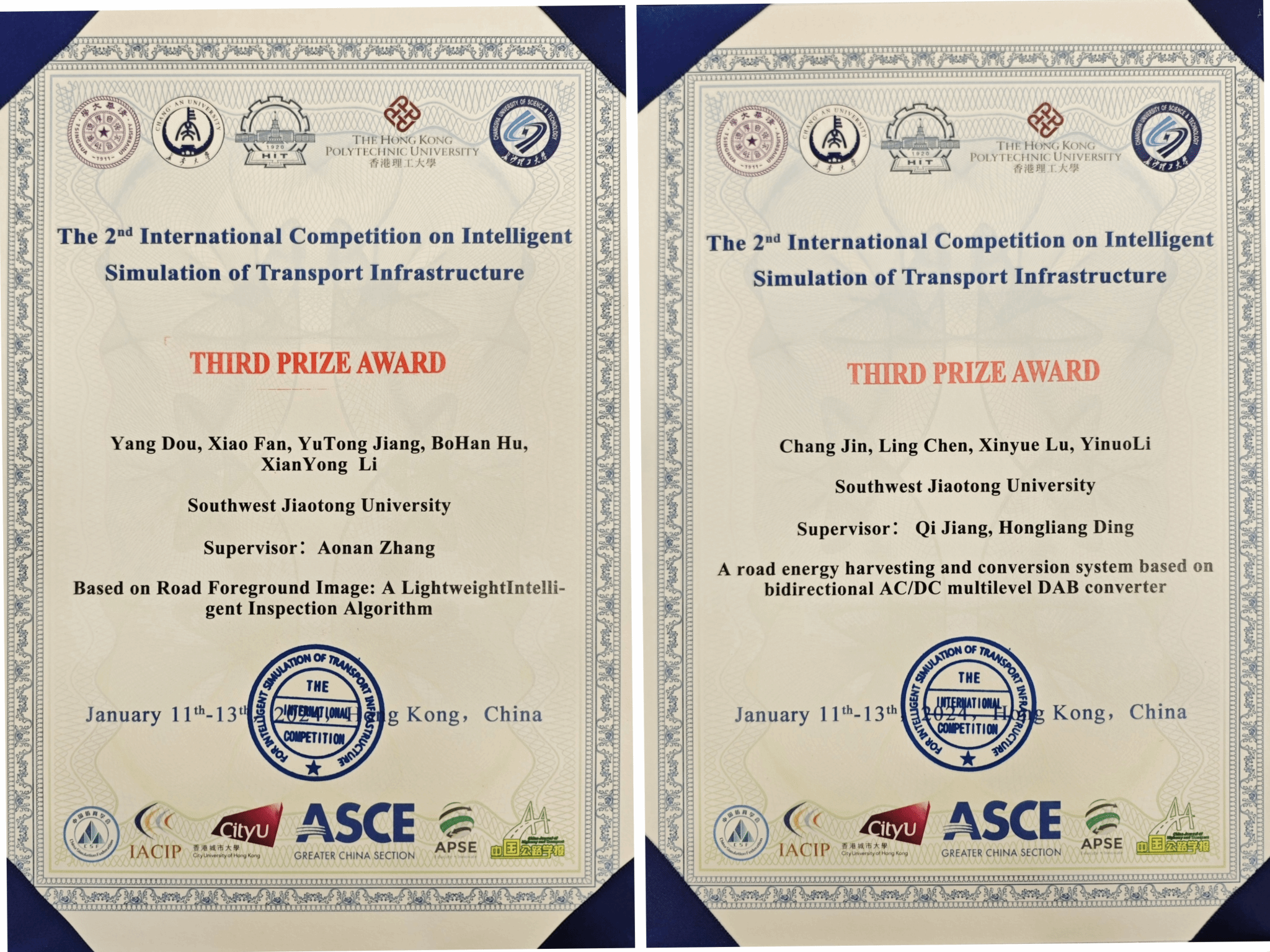 近期,第二届国际交通基础设施智能仿真大赛组委会公布了2023年大赛获奖名单。学院2021级智能建造专业窦杨、樊潇、蒋雨桐、胡博涵、李先勇和智能制造工程专业陈玲、金畅,新能源科学与工程专业李依诺、卢欣悦9名同学参与的两支队伍均获得三等奖,这是学院本科生首次参加国际学科竞赛并获得奖项。