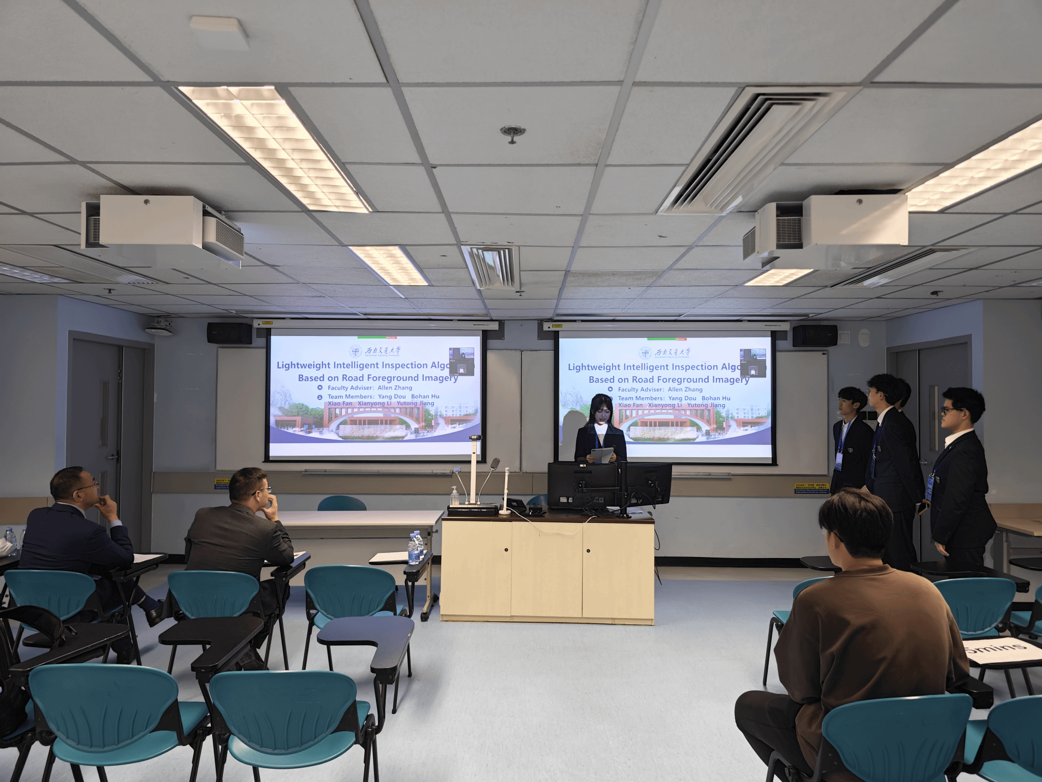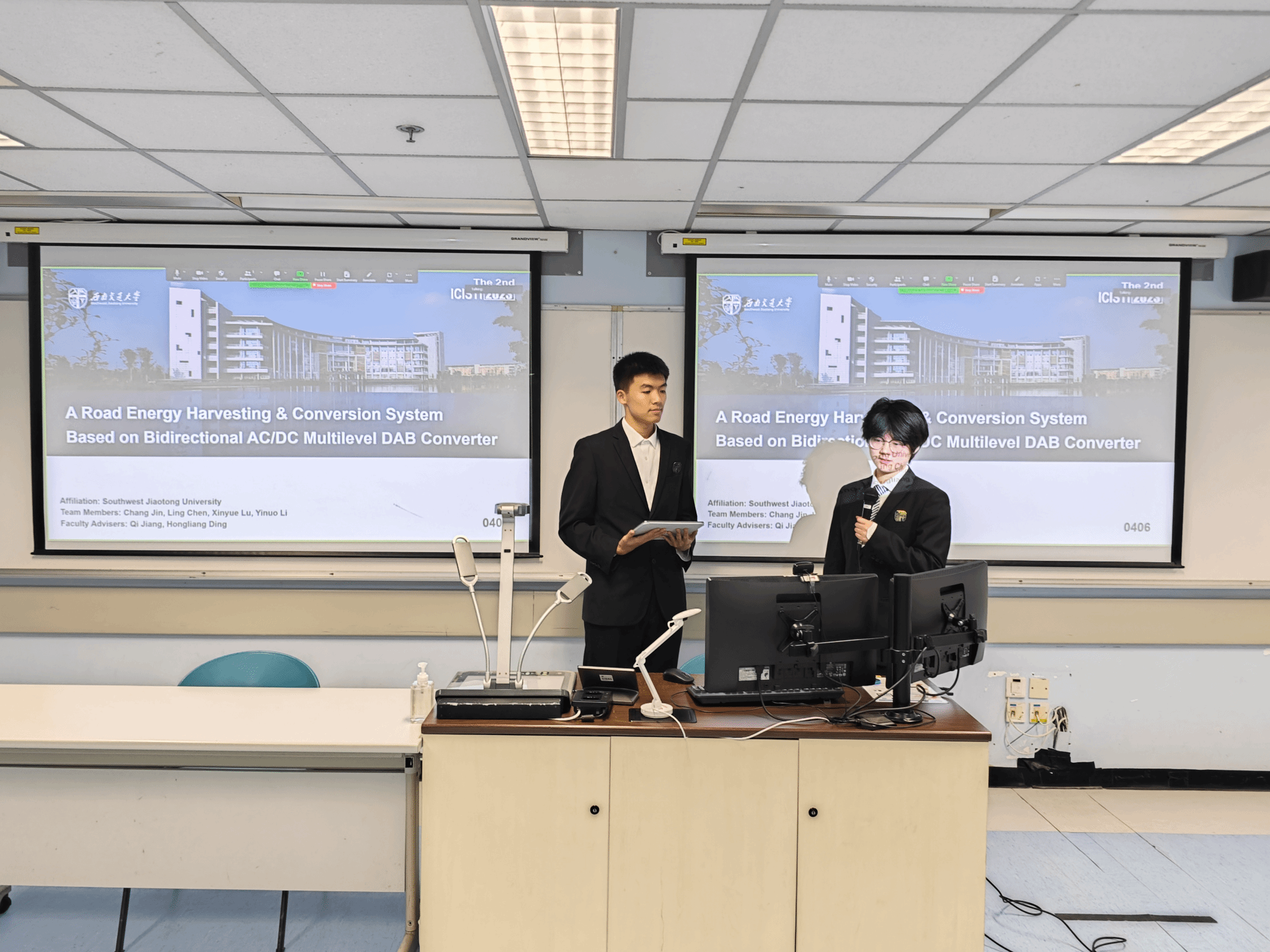 决赛中,学院参赛队伍分别以Based on Road Foreground Image: A Lightweight lntelligent Inspection Algorithm(基于道路前景图像的轻量化智能巡检算法)和A road energy harvesting and conversionsystem based on bidirectional AC/DCmultilevel DAB converter(基于双向AC/DC多电平DAB转换器的道路能量收集与转换系统)为题,全程使用英文陈述和探讨了利用人工智能深度学习技术来精准、快速掌握道路交通资产、路面病害的状况及相关统计数据和“道路能量”的收集储存及直流电与交流电高效率转换问题,并根据评委现场提问进行答辩。