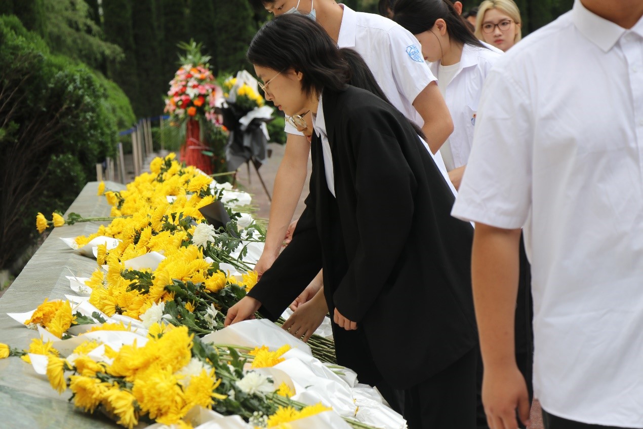 全体师生来到遗址钟表前,垂首哀思,告慰遇难同胞,默哀完毕后,大家迈着沉重的步伐,有序地向遇难同胞献花,致以沉痛哀悼。