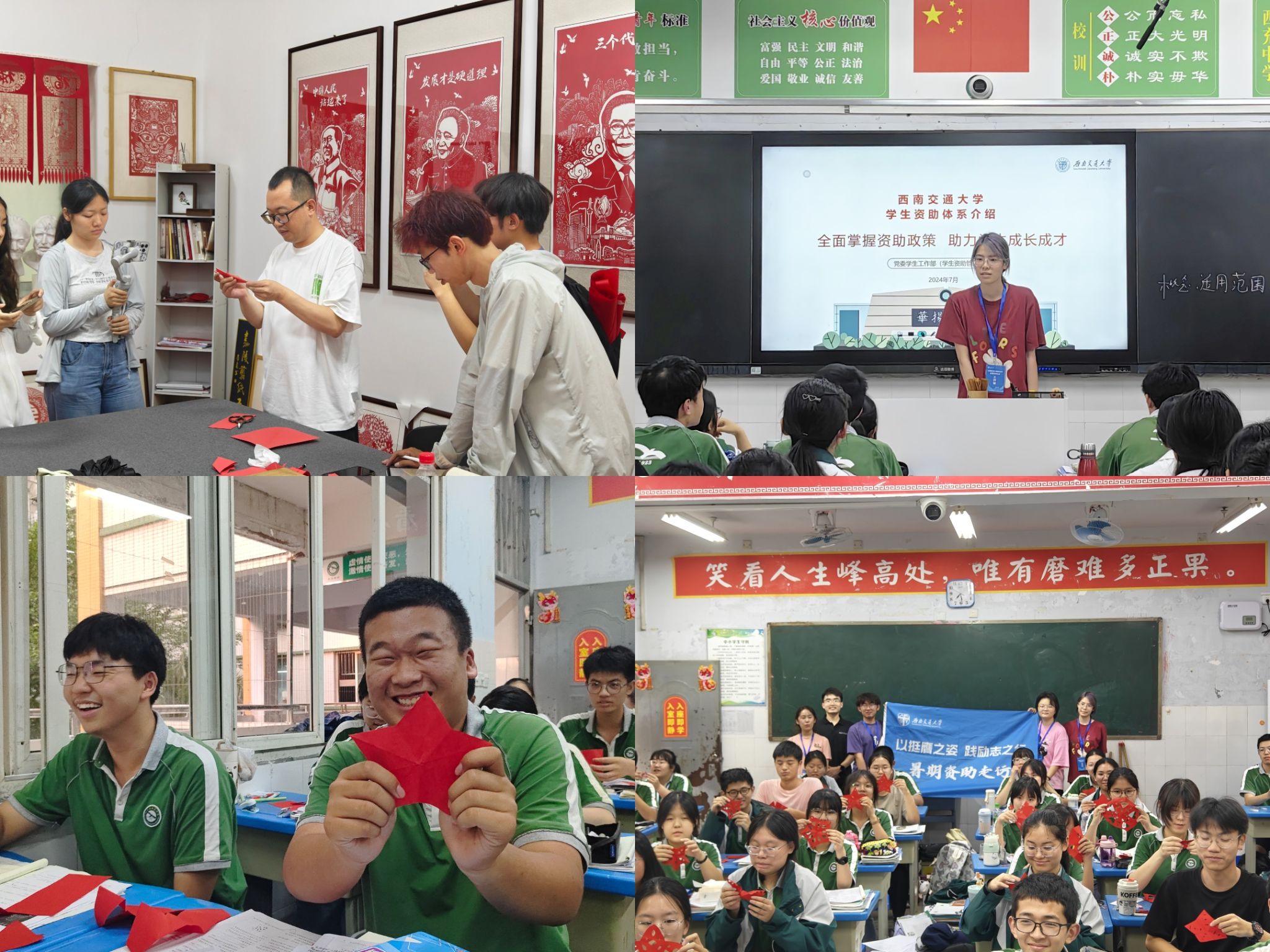 为进一步拓宽资助走访的广度与深度,7月8日,团队在西充县西充中学进行资助政策宣讲。宣讲筹备期间,团队专程造访南充市嘉陵文化馆,诚邀嘉陵剪纸非物质文化遗产传承人杜华江老师为团队传授剪纸技艺。随后,团队以传统剪纸艺术为载体,与学生共同创作了一幅幅寓意深刻的剪纸作品,举办了一场别开生面的政策宣讲会。本次宣讲会既传承了中华优秀传统文化,又加深了学生对国家资助政策的理解与认同,实现了文化教育与资助育人的有机融合。