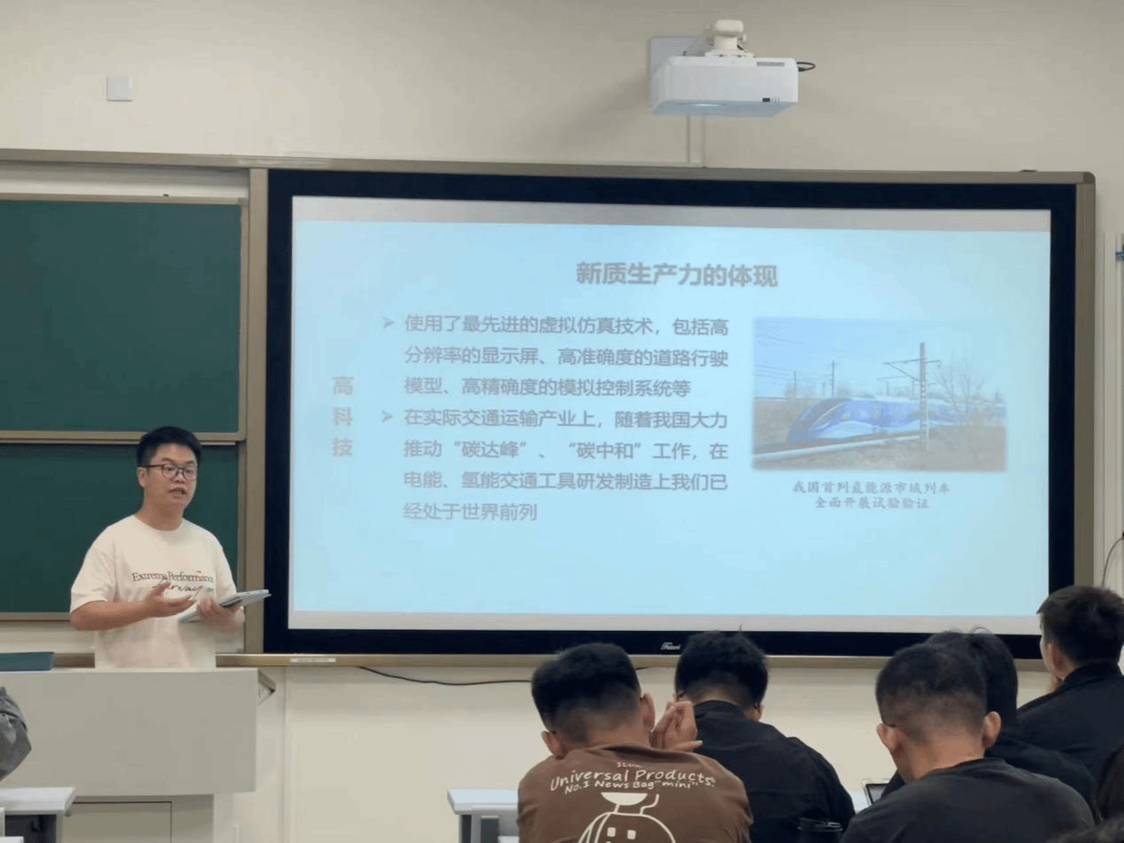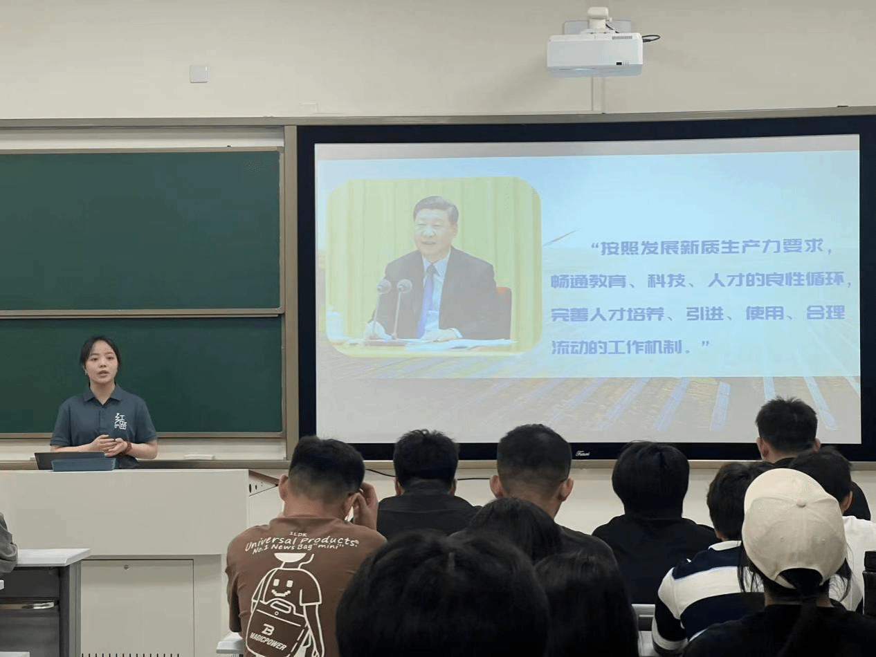 研究生“红路”学讲团成员进行主题分享。她聚焦于“人才创新”的关键词,以“加快创新型人才培养,塑造中国特色创新生态”为主题,重点讲解了发展新质生产力中人才创新与科技、教育一体结合的重要性,带动支部同志们一同思考,在“产学研用”融合的“新工科”教育教学体系下,在新质生产力的发展中,该如何脚踏实地筑梦、逐梦,成为党和国家需要的创新型人才。
