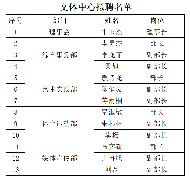 学生文体活动中心的通知》等文件的相关要求,学院学生文体活动中心选聘工作小组本着“公开、公平、公正”的原则,面向全院学生选聘文体中心理事长及各部门部长、副部长。经个人申请、资格审查、现场面试等环节,最终拟聘任以下同学担任2022-2023学年av影片