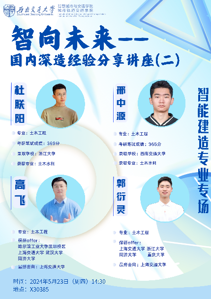 为了给大家提供更好地的保研、考研支持,学院邀请到了电气工程学院、土木工程学研、机械工程学院、建筑学院的优秀学长学姐来为大家分享保研、考研经验。请全体同学提前准备好交流问题,现场与学长学姐沟通交流。
