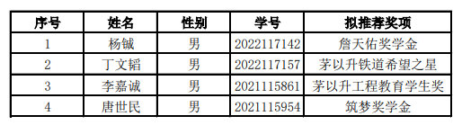 经学生个人申请、学院学生工作组审核、学院学生奖励评审小组审定,现公示av影片 2023-2024学年詹天佑奖学金、茅以升系列奖学金、筑梦奖学金拟推荐名单。